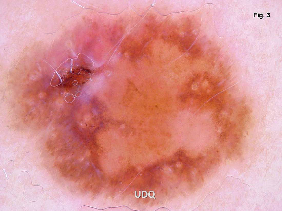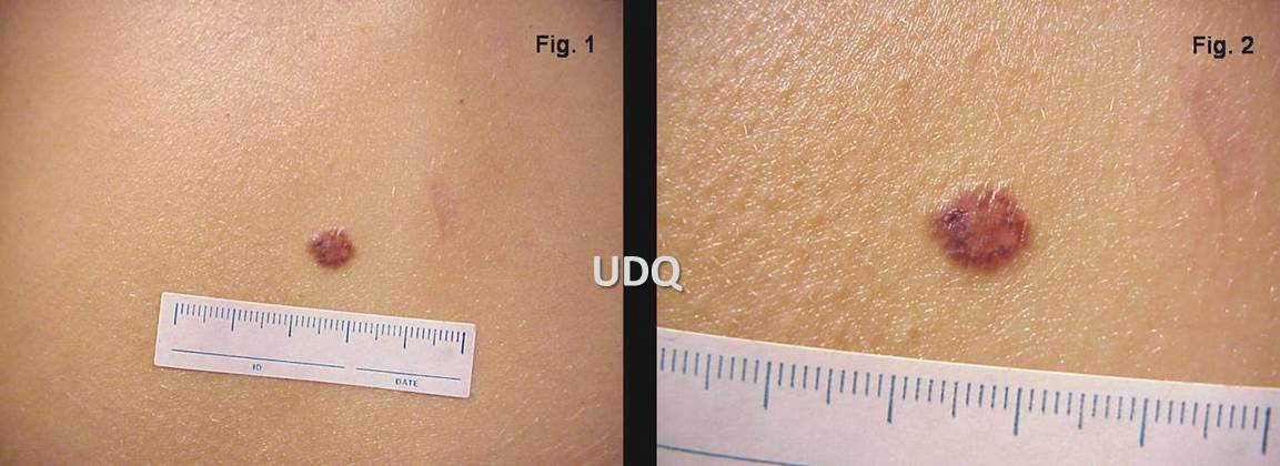 En esta página pueden verse tres imágenes de una misma lesión névica. Fig. 1 simple observación. Fig. 2 observación con lente de aumento. Fig. 3 observación con dermatoscopio.